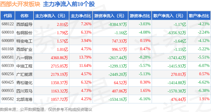 从资金流向上来看,当日西部大开发板块主力资金净流入3.44亿元,游资资金净流出2.11亿元,散户资金净流出1.34亿元。西部大开发板块个股资金流向见下表:
