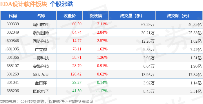 证券之星消息,10月27日EDA设计软件板块较上一交易日上涨1.66%,润和软件领涨。当日上证指数报收于3996.94,上涨1.18%。深证成指报收于13489.4,上涨1.51%。EDA设计软件板块个股涨跌见下表:
