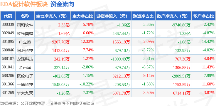 从资金流向上来看,当日EDA设计软件板块主力资金净流入3.58亿元,游资资金净流出9951.82万元,散户资金净流出2.59亿元。EDA设计软件板块个股资金流向见下表: