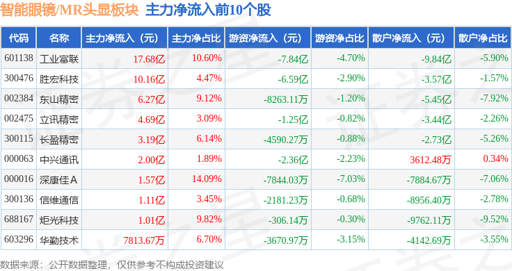 从资金流向上来看,当日智能眼镜/MR头显板块主力资金净流入30.81亿元,游资资金净流出19.08亿元,散户资金净流出11.72亿元。智能眼镜/MR头显板块个股资金流向见下表: