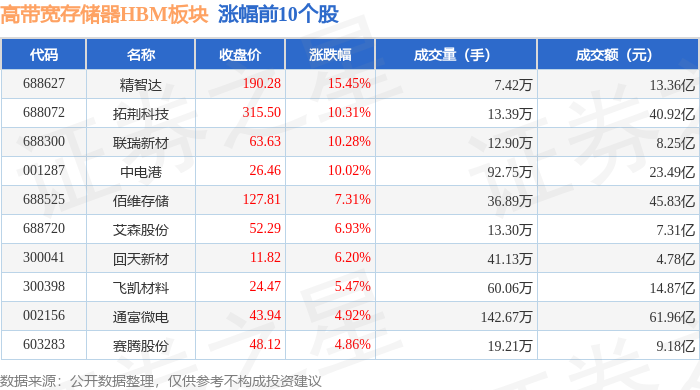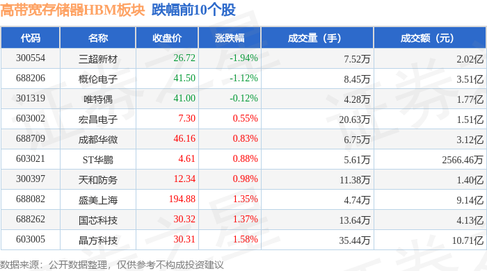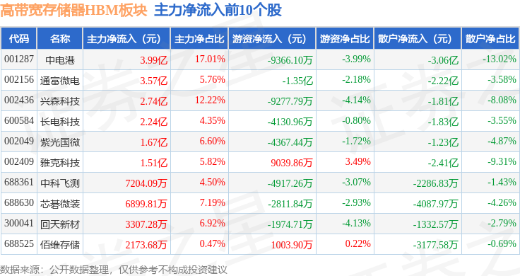 从资金流向上来看,当日高带宽存储器HBM板块主力资金净流入11.6亿元,游资资金净流入5905.12万元,散户资金净流出12.19亿元。高带宽存储器HBM板块个股资金流向见下表:
