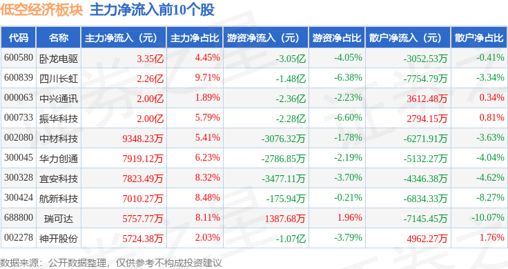从资金流向上来看,当日低空经济板块主力资金净流出20.15亿元,游资资金净流出8.15亿元,散户资金净流入28.29亿元。低空经济板块个股资金流向见下表: