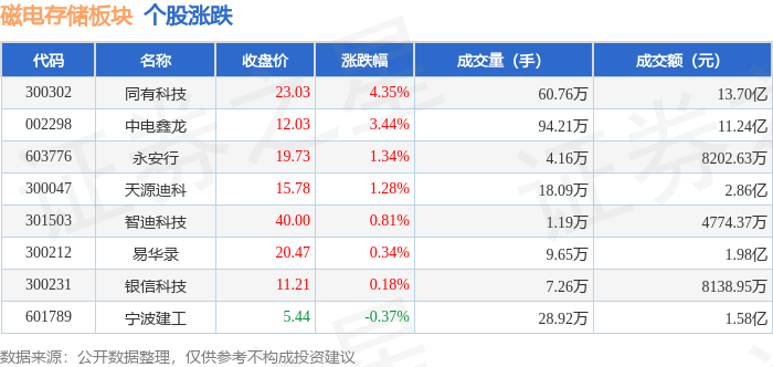 证券之星消息,10月27日磁电存储板块较上一交易日上涨1.51%,同有科技领涨。当日上证指数报收于3996.94,上涨1.18%。深证成指报收于13489.4,上涨1.51%。磁电存储板块个股涨跌见下表: