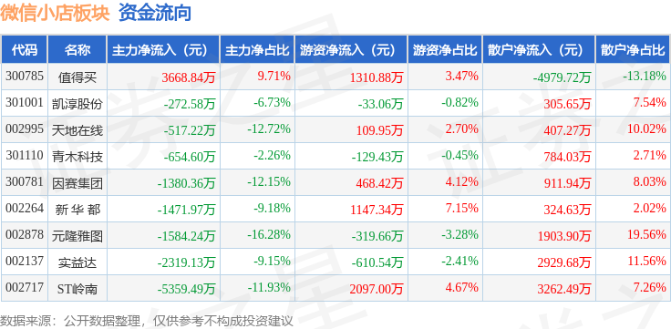 从资金流向上来看,当日微信小店板块主力资金净流出9890.77万元,游资资金净流入4040.89万元,散户资金净流入5849.87万元。微信小店板块个股资金流向见下表: