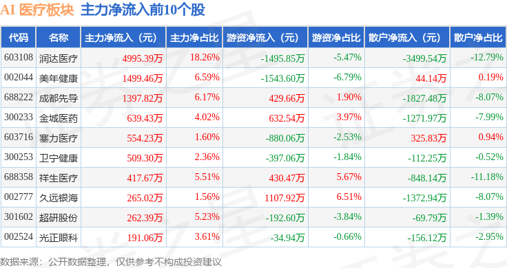 从资金流向上来看,当日AI 医疗板块主力资金净流出594.16万元,游资资金净流出1529.47万元,散户资金净流入2123.63万元。AI 医疗板块个股资金流向见下表: