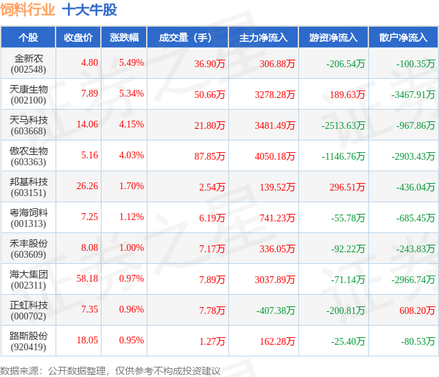 个股表现方面,饲料行业当日领涨股为金新农(002548),该股当日报收4.8,上涨5.49%,成交量36.9万,主力资金净流入306.88万元。天康生物(002100)以上涨5.34%紧随其后,该股当日成交量50.66万,主力资金净流入3278.28万元。除此之外,天马科技(603668)、傲农生物(603363)、邦基科技(603151)均进入当日牛股之列。具体个股列表见下表:
