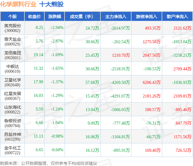个股表现方面,化学原料行业当日领跌股为奥克股份(300082),该股当日报收8.25,下跌2.94%,成交量24.72万,主力资金净流出2614.97万元。雪天盐业(600929)以下跌2.87%紧随其后,该股当日成交量30.66万,主力资金净流出262.54万元。除此之外,龙佰集团(002601)、中毅达(600610)、卫星化学(002648)均进入当日熊股之列。具体个股列表见下表: