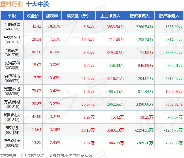 个股表现方面,塑料行业当日领涨股为万朗磁塑(603150),该股当日报收41.42,上涨10.01%,成交量6.64万,主力资金净流入3933.54万元。宁波色母(301019)以上涨7.51%紧随其后,该股当日成交量10.24万,主力资金净流入712.46万元。除此之外,骏鼎达(301538)、长鸿高科(605008)、佛塑科技(000973)均进入当日牛股之列。具体个股列表见下表: