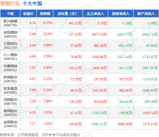 个股表现方面,普钢行业当日领涨股为新兴铸管(000778),该股当日报收4.32,上涨6.93%,成交量401.21万,主力资金净流入2.33亿元。安阳钢铁(600569)以上涨5.63%紧随其后,该股当日成交量157.1万,主力资金净流入8475.53万元。除此之外,三钢闽光(002110)、八一钢铁(600581)、华菱钢铁(000932)均进入当日牛股之列。具体个股列表见下表: