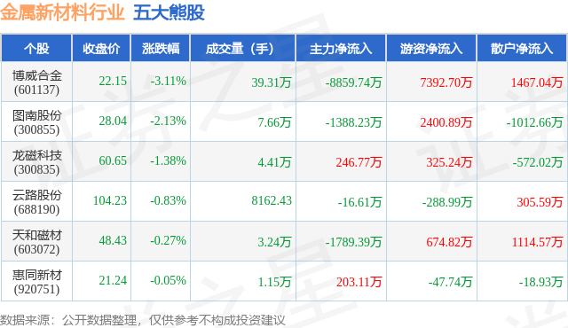 个股表现方面,金属新材料行业当日领跌股为博威合金(601137),该股当日报收22.15,下跌3.11%,成交量39.31万,主力资金净流出8859.74万元。图南股份(300855)以下跌2.13%紧随其后,该股当日成交量7.66万,主力资金净流出1388.23万元。除此之外,龙磁科技(300835)、云路股份(688190)、天和磁材(603072)均进入当日熊股之列。具体个股列表见下表: