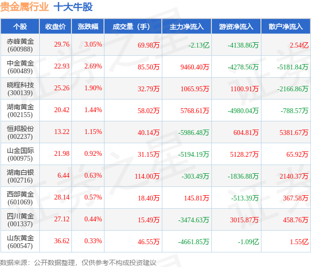 个股表现方面,贵金属行业当日领涨股为赤峰黄金(600988),该股当日报收29.76,上涨3.05%,成交量69.98万,主力资金净流出2.13亿元。中金黄金(600489)以上涨2.69%紧随其后,该股当日成交量85.5万,主力资金净流入9460.4万元。除此之外,晓程科技(300139)、湖南黄金(002155)、恒邦股份(002237)均进入当日牛股之列。具体个股列表见下表: