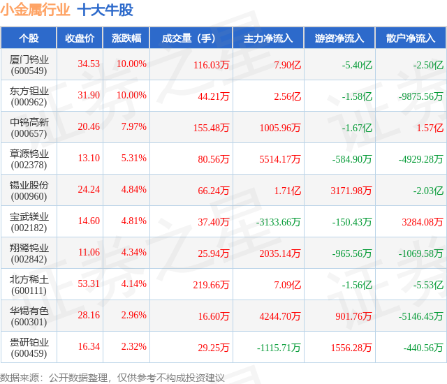 个股表现方面,小金属行业当日领涨股为厦门钨业(600549),该股当日报收34.53,上涨10.0%,成交量116.03万,主力资金净流入7.9亿元。东方钽业(000962)以上涨10.0%紧随其后,该股当日成交量44.21万,主力资金净流入2.56亿元。除此之外,中钨高新(000657)、章源钨业(002378)、锡业股份(000960)均进入当日牛股之列。具体个股列表见下表: