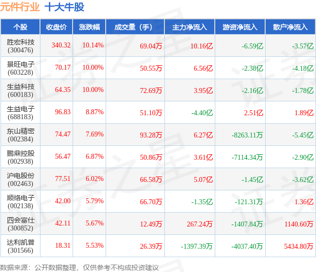 个股表现方面,元件行业当日领涨股为胜宏科技(300476),该股当日报收340.32,上涨10.14%,成交量69.04万,主力资金净流入10.16亿元。景旺电子(603228)以上涨10.0%紧随其后,该股当日成交量50.55万,主力资金净流入6.56亿元。除此之外,生益科技(600183)、生益电子(688183)、东山精密(002384)均进入当日牛股之列。具体个股列表见下表: