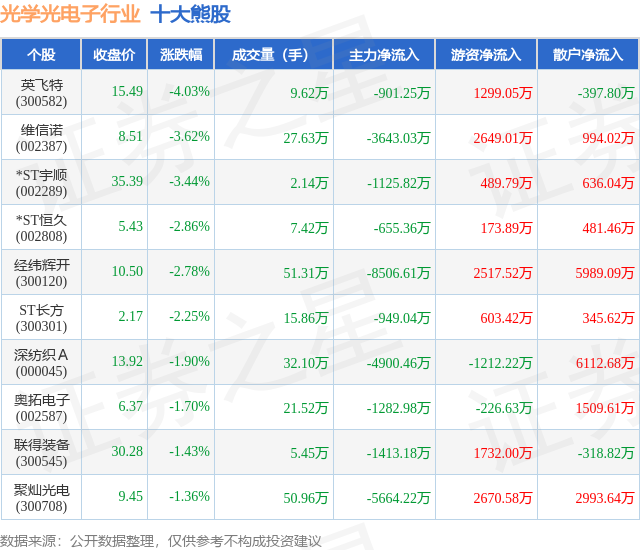 个股表现方面,光学光电子行业当日领跌股为英飞特(300582),该股当日报收15.49,下跌4.03%,成交量9.62万,主力资金净流出901.25万元。维信诺(002387)以下跌3.62%紧随其后,该股当日成交量27.63万,主力资金净流出3643.03万元。除此之外,*ST宇顺(002289)、*ST恒久(002808)、经纬辉开(300120)均进入当日熊股之列。具体个股列表见下表: