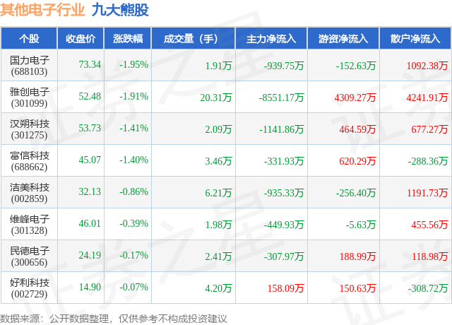 个股表现方面,其他电子行业当日领跌股为国力电子(688103),该股当日报收73.34,下跌1.95%,成交量1.91万,主力资金净流出939.75万元。雅创电子(301099)以下跌1.91%紧随其后,该股当日成交量20.31万,主力资金净流出8551.17万元。除此之外,汉朔科技(301275)、富信科技(688662)、洁美科技(002859)均进入当日熊股之列。具体个股列表见下表: