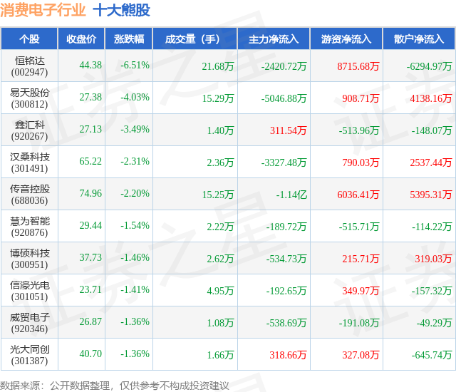 个股表现方面,消费电子行业当日领跌股为恒铭达(002947),该股当日报收44.38,下跌6.51%,成交量21.68万,主力资金净流出2420.72万元。易天股份(300812)以下跌4.03%紧随其后,该股当日成交量15.29万,主力资金净流出5046.88万元。除此之外,鑫汇科(920267)、汉桑科技(301491)、传音控股(688036)均进入当日熊股之列。具体个股列表见下表: