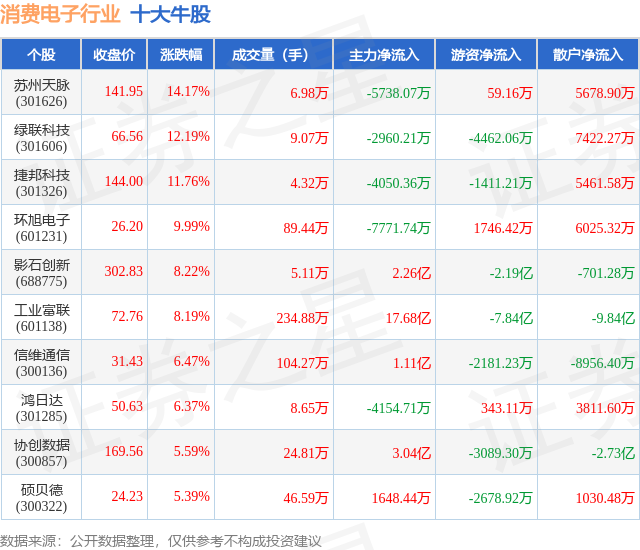 个股表现方面,消费电子行业当日领涨股为苏州天脉(301626),该股当日报收141.95,上涨14.17%,成交量6.98万,主力资金净流出5738.07万元。绿联科技(301606)以上涨12.19%紧随其后,该股当日成交量9.07万,主力资金净流出2960.21万元。除此之外,捷邦科技(301326)、环旭电子(601231)、影石创新(688775)均进入当日牛股之列。具体个股列表见下表: