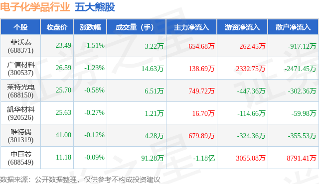 个股表现方面,电子化学品行业当日领跌股为菲沃泰(688371),该股当日报收23.49,下跌1.51%,成交量3.22万,主力资金净流入654.68万元。广信材料(300537)以下跌1.23%紧随其后,该股当日成交量14.63万,主力资金净流入138.69万元。除此之外,莱特光电(688150)、凯华材料(920526)、唯特偶(301319)均进入当日熊股之列。具体个股列表见下表: