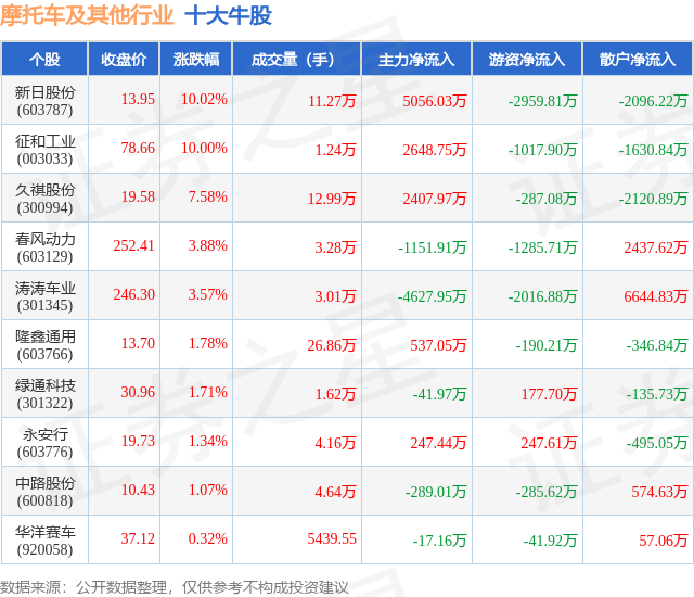 个股表现方面,摩托车及其他行业当日领涨股为新日股份(603787),该股当日报收13.95,上涨10.02%,成交量11.27万,主力资金净流入5056.03万元。征和工业(003033)以上涨10.0%紧随其后,该股当日成交量1.24万,主力资金净流入2648.75万元。除此之外,久祺股份(300994)、春风动力(603129)、涛涛车业(301345)均进入当日牛股之列。具体个股列表见下表: