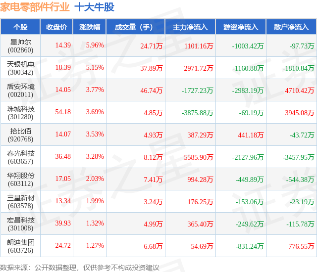 个股表现方面,家电零部件行业当日领涨股为星帅尔(002860),该股当日报收14.39,上涨5.96%,成交量24.71万,主力资金净流入1101.16万元。天银机电(300342)以上涨5.15%紧随其后,该股当日成交量37.89万,主力资金净流入2971.72万元。除此之外,盾安环境(002011)、珠城科技(301280)、拾比佰(920768)均进入当日牛股之列。具体个股列表见下表: