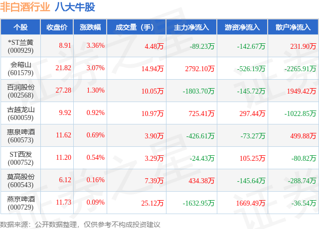 个股表现方面,非白酒行业当日领涨股为*ST兰黄(000929),该股当日报收8.91,上涨3.36%,成交量4.48万,主力资金净流出89.23万元。会稽山(601579)以上涨3.07%紧随其后,该股当日成交量14.94万,主力资金净流入2792.1万元。除此之外,百润股份(002568)、古越龙山(600059)、惠泉啤酒(600573)均进入当日牛股之列。具体个股列表见下表: