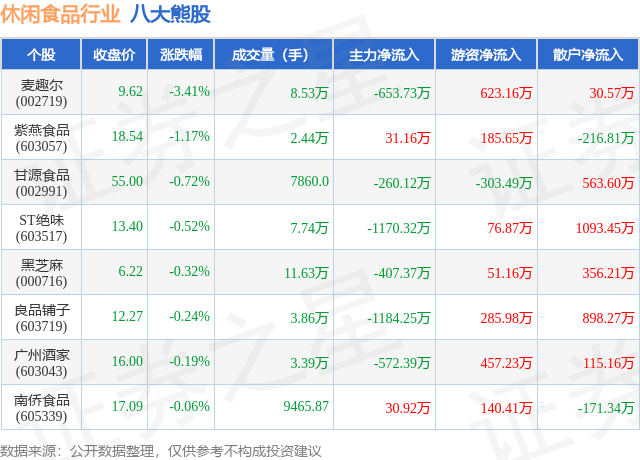 个股表现方面,休闲食品行业当日领跌股为麦趣尔(002719),该股当日报收9.62,下跌3.41%,成交量8.53万,主力资金净流出653.73万元。紫燕食品(603057)以下跌1.17%紧随其后,该股当日成交量2.44万,主力资金净流入31.16万元。除此之外,甘源食品(002991)、ST绝味(603517)、黑芝麻(000716)均进入当日熊股之列。具体个股列表见下表: