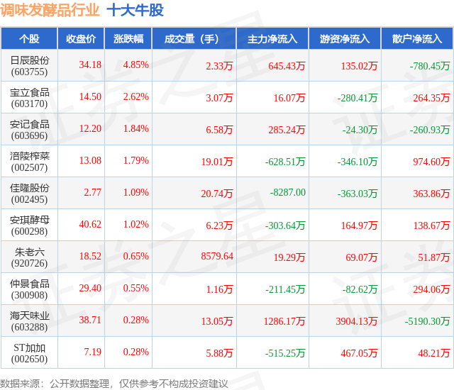 个股表现方面,调味发酵品行业当日领涨股为日辰股份(603755),该股当日报收34.18,上涨4.85%,成交量2.33万,主力资金净流入645.43万元。宝立食品(603170)以上涨2.62%紧随其后,该股当日成交量3.07万,主力资金净流入16.07万元。除此之外,安记食品(603696)、涪陵榨菜(002507)、佳隆股份(002495)均进入当日牛股之列。具体个股列表见下表: