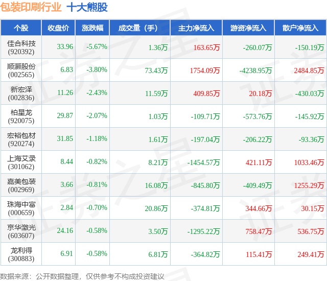 个股表现方面,包装印刷行业当日领跌股为佳合科技(920392),该股当日报收33.96,下跌5.67%,成交量1.36万,主力资金净流入163.65万元。顺灏股份(002565)以下跌3.8%紧随其后,该股当日成交量73.43万,主力资金净流入1754.09万元。除此之外,新宏泽(002836)、柏星龙(920075)、宏裕包材(920274)均进入当日熊股之列。具体个股列表见下表: