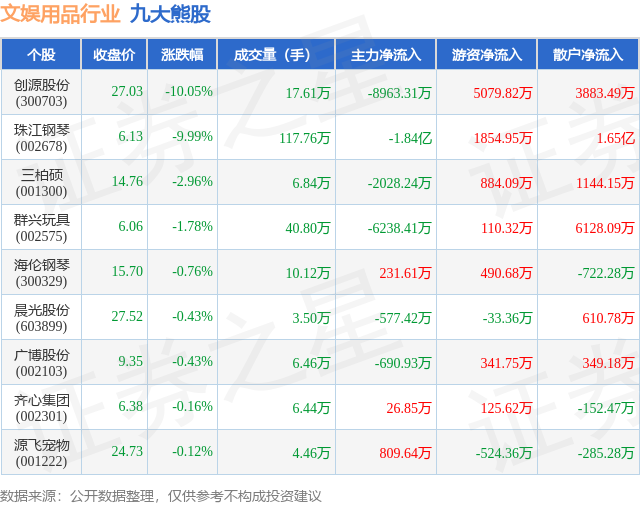 个股表现方面,文娱用品行业当日领跌股为创源股份(300703),该股当日报收27.03,下跌10.05%,成交量17.61万,主力资金净流出8963.31万元。珠江钢琴(002678)以下跌9.99%紧随其后,该股当日成交量117.76万,主力资金净流出1.84亿元。除此之外,三柏硕(001300)、群兴玩具(002575)、海伦钢琴(300329)均进入当日熊股之列。具体个股列表见下表: