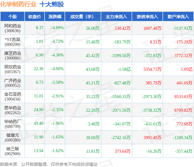 个股表现方面,化学制药行业当日领跌股为同和药业(300636),该股当日报收8.37,下跌4.89%,成交量26.0万,主力资金净流入530.42万元。*ST苏吴(600200)以下跌4.72%紧随其后,该股当日成交量15.48万,主力资金净流出183.79万元。除此之外,康芝药业(300086)、辰欣药业(603367)、广济药业(000952)均进入当日熊股之列。具体个股列表见下表: