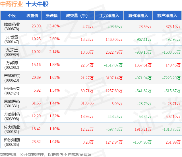 个股表现方面,中药行业当日领涨股为维康药业(300878),该股当日报收23.9,上涨3.46%,成交量4.74万,主力资金净流出403.69万元。ST香雪(300147)以上涨2.6%紧随其后,该股当日成交量13.28万,主力资金净流入1460.05万元。除此之外,九芝堂(000989)、万邦德(002082)、吉林敖东(000623)均进入当日牛股之列。具体个股列表见下表: