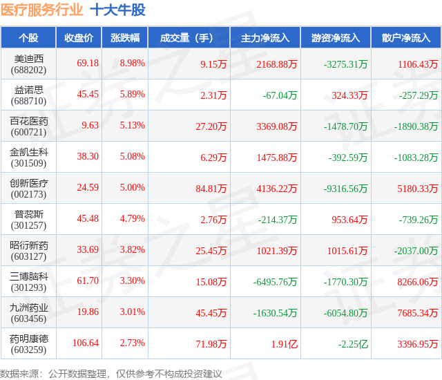 个股表现方面,医疗服务行业当日领涨股为美迪西(688202),该股当日报收69.18,上涨8.98%,成交量9.15万,主力资金净流入2168.88万元。益诺思(688710)以上涨5.89%紧随其后,该股当日成交量2.31万,主力资金净流出67.04万元。除此之外,百花医药(600721)、金凯生科(301509)、创新医疗(002173)均进入当日牛股之列。具体个股列表见下表: