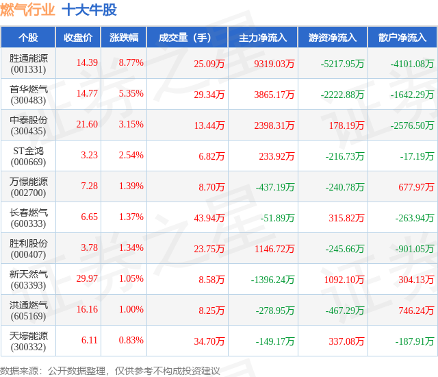 个股表现方面,燃气行业当日领涨股为胜通能源(001331),该股当日报收14.39,上涨8.77%,成交量25.09万,主力资金净流入9319.03万元。首华燃气(300483)以上涨5.35%紧随其后,该股当日成交量29.34万,主力资金净流入3865.17万元。除此之外,中泰股份(300435)、ST金鸿(000669)、万憬能源(002700)均进入当日牛股之列。具体个股列表见下表: