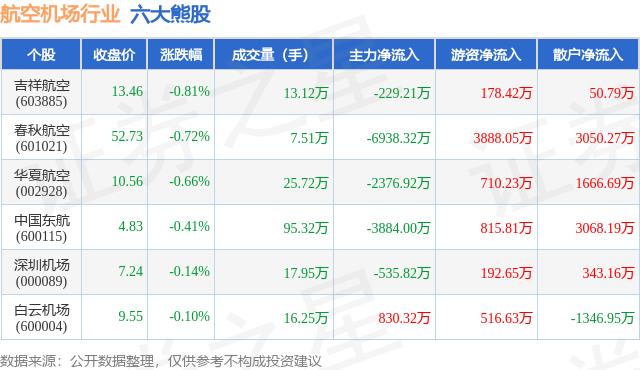个股表现方面,航空机场行业当日领跌股为吉祥航空(603885),该股当日报收13.46,下跌0.81%,成交量13.12万,主力资金净流出229.21万元。春秋航空(601021)以下跌0.72%紧随其后,该股当日成交量7.51万,主力资金净流出6938.32万元。除此之外,华夏航空(002928)、中国东航(600115)、深圳机场(000089)均进入当日熊股之列。具体个股列表见下表: