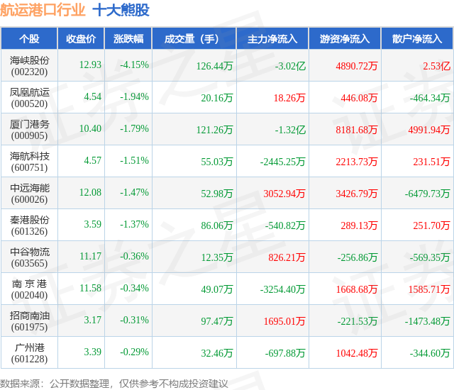 个股表现方面,航运港口行业当日领跌股为海峡股份(002320),该股当日报收12.93,下跌4.15%,成交量126.44万,主力资金净流出3.02亿元。凤凰航运(000520)以下跌1.94%紧随其后,该股当日成交量20.16万,主力资金净流入18.26万元。除此之外,厦门港务(000905)、海航科技(600751)、中远海能(600026)均进入当日熊股之列。具体个股列表见下表: