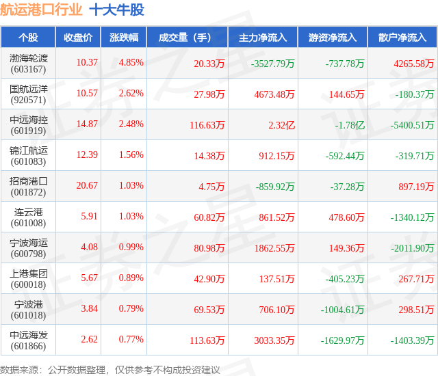 个股表现方面,航运港口行业当日领涨股为渤海轮渡(603167),该股当日报收10.37,上涨4.85%,成交量20.33万,主力资金净流出3527.79万元。国航远洋(920571)以上涨2.62%紧随其后,该股当日成交量27.98万,主力资金净流入4673.48万元。除此之外,中远海控(601919)、锦江航运(601083)、招商港口(001872)均进入当日牛股之列。具体个股列表见下表: