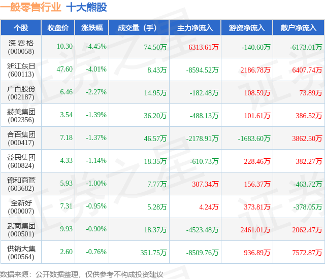 个股表现方面,一般零售行业当日领跌股为深 赛 格(000058),该股当日报收10.3,下跌4.45%,成交量74.5万,主力资金净流入6313.61万元。浙江东日(600113)以下跌4.01%紧随其后,该股当日成交量8.43万,主力资金净流出8594.52万元。除此之外,广百股份(002187)、赫美集团(002356)、合百集团(000417)均进入当日熊股之列。具体个股列表见下表: