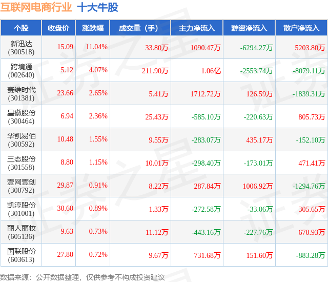 个股表现方面,互联网电商行业当日领涨股为新迅达(300518),该股当日报收15.09,上涨11.04%,成交量33.8万,主力资金净流入1090.47万元。跨境通(002640)以上涨4.07%紧随其后,该股当日成交量211.9万,主力资金净流入1.06亿元。除此之外,赛维时代(301381)、星徽股份(300464)、华凯易佰(300592)均进入当日牛股之列。具体个股列表见下表: