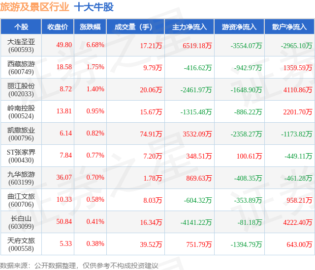个股表现方面,旅游及景区行业当日领涨股为大连圣亚(600593),该股当日报收49.8,上涨6.68%,成交量17.21万,主力资金净流入6519.18万元。西藏旅游(600749)以上涨1.75%紧随其后,该股当日成交量9.79万,主力资金净流出416.62万元。除此之外,丽江股份(002033)、岭南控股(000524)、凯撒旅业(000796)均进入当日牛股之列。具体个股列表见下表: