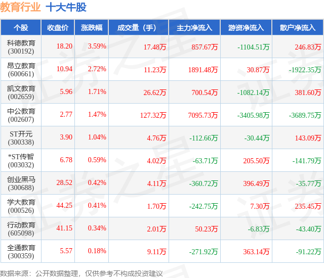 个股表现方面,教育行业当日领涨股为科德教育(300192),该股当日报收18.2,上涨3.59%,成交量17.48万,主力资金净流入857.67万元。昂立教育(600661)以上涨2.72%紧随其后,该股当日成交量11.23万,主力资金净流入1891.48万元。除此之外,凯文教育(002659)、中公教育(002607)、ST开元(300338)均进入当日牛股之列。具体个股列表见下表:
