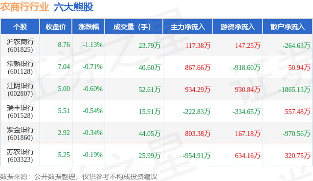 个股表现方面,农商行行业当日领跌股为沪农商行(601825),该股当日报收8.76,下跌1.13%,成交量23.79万,主力资金净流入117.38万元。常熟银行(601128)以下跌0.71%紧随其后,该股当日成交量40.6万,主力资金净流入867.66万元。除此之外,江阴银行(002807)、瑞丰银行(601528)、紫金银行(601860)均进入当日熊股之列。具体个股列表见下表: