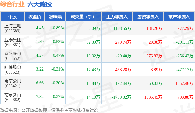 个股表现方面,综合行业当日领跌股为上海三毛(600689),该股当日报收14.45,下跌0.89%,成交量6.09万,主力资金净流出1158.55万元。亚泰集团(600881)以下跌0.53%紧随其后,该股当日成交量52.39万,主力资金净流入270.74万元。除此之外,泰达股份(000652)、红棉股份(000523)、南京公用(000421)均进入当日熊股之列。具体个股列表见下表: