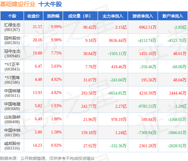 个股表现方面,基础建设行业当日领涨股为汇绿生态(001267),该股当日报收21.57,上涨9.99%,成交量90.42万,主力资金净流入2.15亿元。园林股份(605303)以上涨9.98%紧随其后,该股当日成交量9.18万,主力资金净流入8636.44万元。除此之外,冠中生态(300948)、*ST正平(603843)、*ST围海(002586)均进入当日牛股之列。具体个股列表见下表: