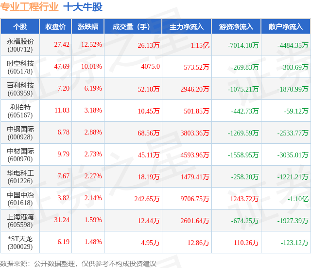 个股表现方面,专业工程行业当日领涨股为永福股份(300712),该股当日报收27.42,上涨12.52%,成交量26.13万,主力资金净流入1.15亿元。时空科技(605178)以上涨10.01%紧随其后,该股当日成交量4075.0,主力资金净流入573.52万元。除此之外,百利科技(603959)、利柏特(605167)、中钢国际(000928)均进入当日牛股之列。具体个股列表见下表:
