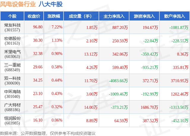 个股表现方面,风电设备行业当日领涨股为常友科技(301557),该股当日报收96.8,上涨7.22%,成交量1.85万,主力资金净流入887.2万元。宏德股份(301163)以上涨1.13%紧随其后,该股当日成交量2.1万,主力资金净流入250.59万元。除此之外,禾望电气(603063)、三一重能(688349)、双一科技(300690)均进入当日牛股之列。具体个股列表见下表:
