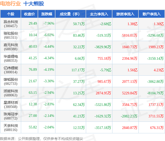 个股表现方面,电池行业当日领跌股为赢合科技(300457),该股当日报收29.49,下跌7.96%,成交量50.71万,主力资金净流出2.68亿元。骆驼股份(601311)以下跌6.02%紧随其后,该股当日成交量83.46万,主力资金净流出519.33万元。除此之外,嘉元科技(688388)、华盛锂电(688353)、亿纬锂能(300014)均进入当日熊股之列。具体个股列表见下表: