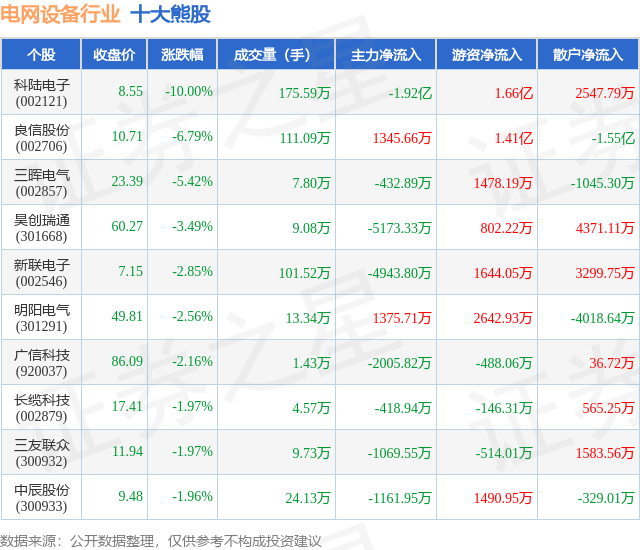 个股表现方面,电网设备行业当日领跌股为科陆电子(002121),该股当日报收8.55,下跌10.0%,成交量175.59万,主力资金净流出1.92亿元。良信股份(002706)以下跌6.79%紧随其后,该股当日成交量111.09万,主力资金净流入1345.66万元。除此之外,三晖电气(002857)、昊创瑞通(301668)、新联电子(002546)均进入当日熊股之列。具体个股列表见下表: