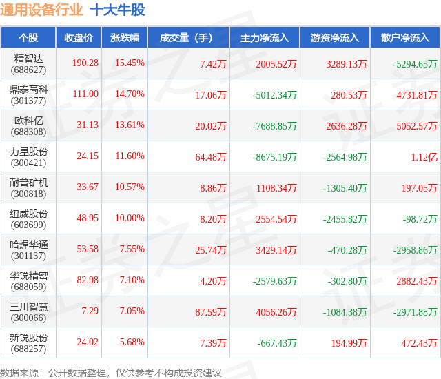 个股表现方面,通用设备行业当日领涨股为精智达(688627),该股当日报收190.28,上涨15.45%,成交量7.42万,主力资金净流入2005.52万元。鼎泰高科(301377)以上涨14.7%紧随其后,该股当日成交量17.06万,主力资金净流出5012.34万元。除此之外,欧科亿(688308)、力星股份(300421)、耐普矿机(300818)均进入当日牛股之列。具体个股列表见下表: