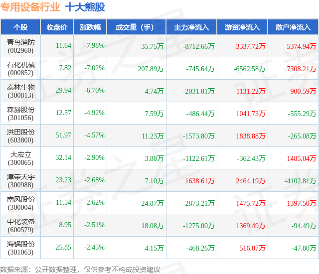 个股表现方面,专用设备行业当日领跌股为青鸟消防(002960),该股当日报收11.64,下跌7.98%,成交量35.75万,主力资金净流出8712.66万元。石化机械(000852)以下跌7.02%紧随其后,该股当日成交量207.89万,主力资金净流出745.64万元。除此之外,泰林生物(300813)、森赫股份(301056)、洪田股份(603800)均进入当日熊股之列。具体个股列表见下表: