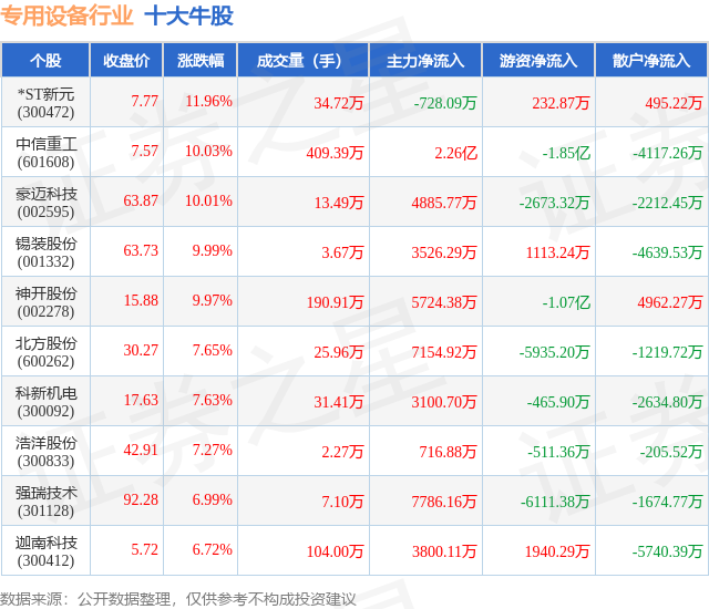 个股表现方面,专用设备行业当日领涨股为*ST新元(300472),该股当日报收7.77,上涨11.96%,成交量34.72万,主力资金净流出728.09万元。中信重工(601608)以上涨10.03%紧随其后,该股当日成交量409.39万,主力资金净流入2.26亿元。除此之外,豪迈科技(002595)、锡装股份(001332)、神开股份(002278)均进入当日牛股之列。具体个股列表见下表: